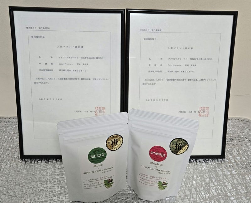 アドバンスカラーティー『前進するお茶(R)』赤ENERGY、アドバンスカラーティー『前進するお茶(R)』緑RELAXは、入間ブランドに認定されています。