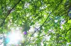 黄緑の木々の間から、紫の光の反射がぼんやりと見えます。